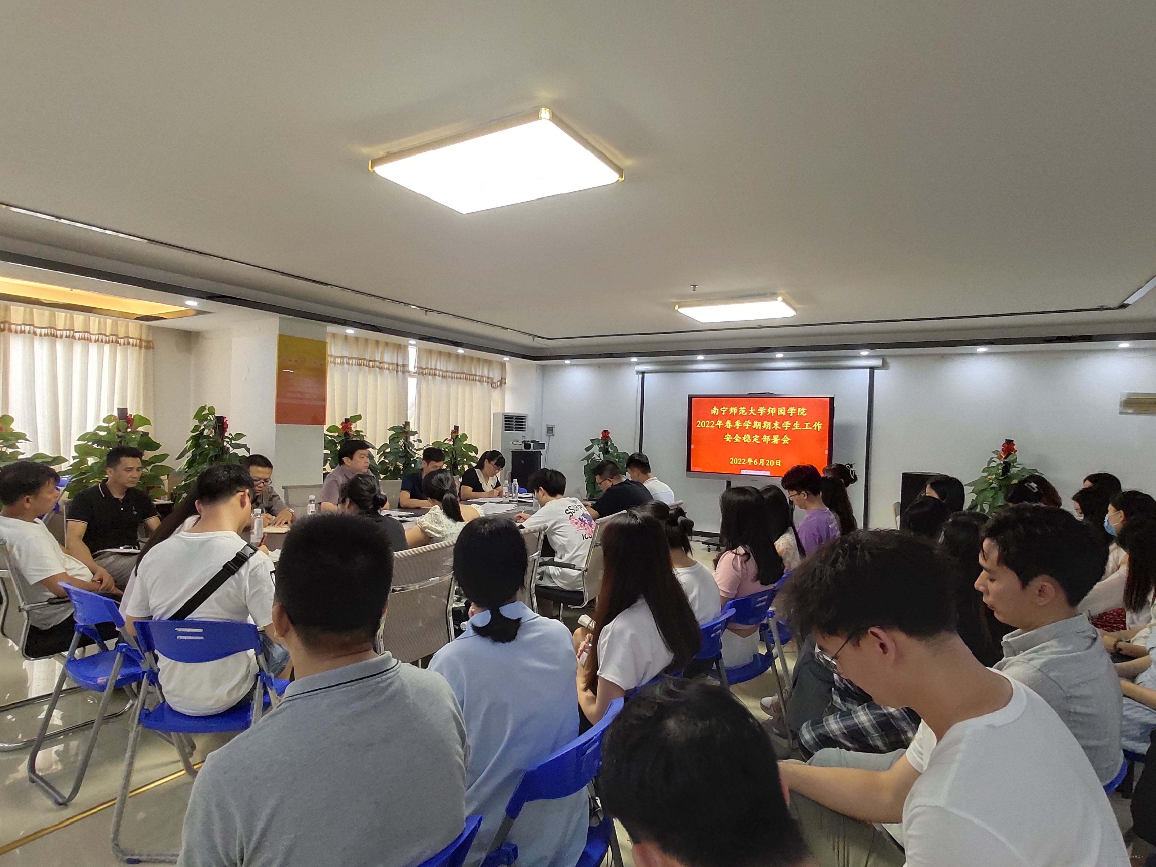 本次会议的召开,明确了春季学期期末学生工作安全稳定的主要任务,进一步促进学生安全管理的制度化、规范化、科学化,以实际行动推动期末学生安全稳定工作再上新的台阶。