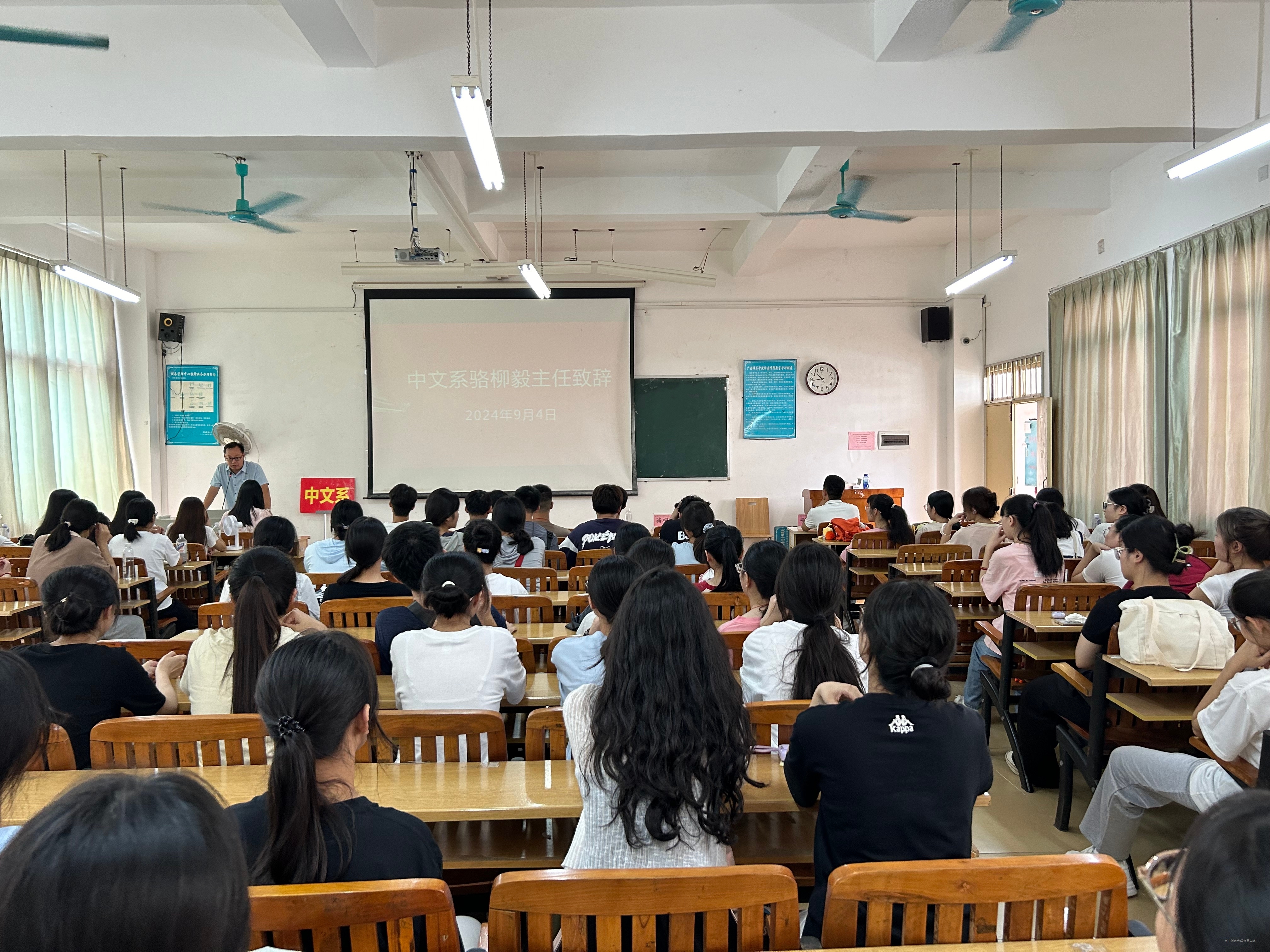 9月4日上午,中文系在教学楼3-302教室召开2024级新生入学教育大会,中文系主任骆柳毅与骨干教师黄曼婷,学工组组长韦林志,学工组副组长蒋丽娟,以及全体2024级新生参加会议 香蕉视频APP官网。