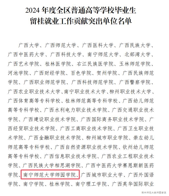 《自治区教育厅关于表扬2024年全区普通高等91香蕉在线观看就业创业工作突出单位和留桂就业工作贡献突出单位的通知》(桂教学生〔2024〕25号)公布 香蕉视频APP官网,我院荣获2024年度“全区普通高等91香蕉在线观看毕业生留桂就业工作贡献突出单位”称号。